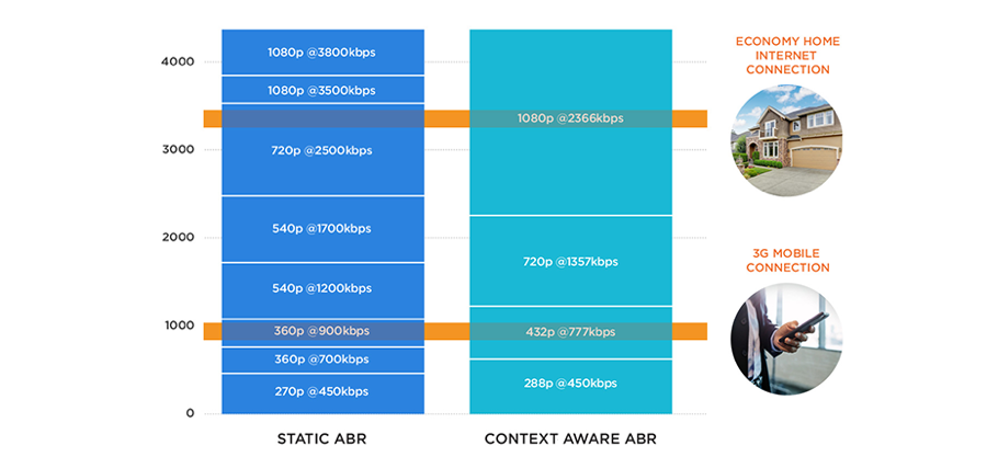 Similarly, a user with an economy-priced residential internet plan supplying 3,000kbps of sustained bandwidth would top out at the 720p rendition under the static ABR ladder, while they would be able to stream at full 1080p using Context Aware Encoding, delivering a Full HD experience.