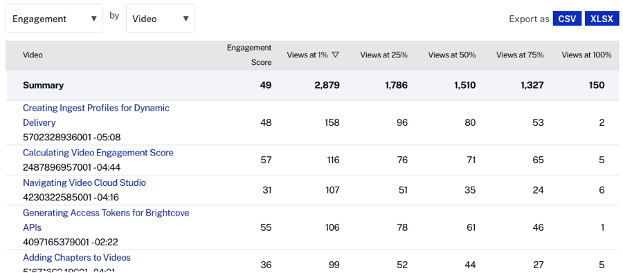 - Click on a video title to view the engagement data for that video. The graph shows the number of video views over time. Spikes in the graph indicate that part of the video was watched over and over again. Sudden drops in engagement should also be investigated.