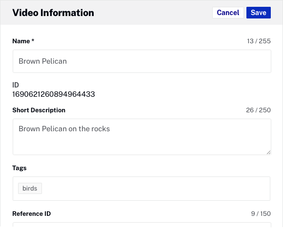 - Click on the title for the http://support.brightcove.com/test-assets/videos/oystercatcher.mp4 video, locate the Video Information section and then click Edit. Set the following properties: