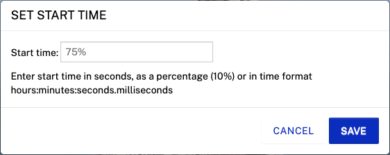 - Enter a Start time in seconds, as a percentage or in time format. This example sets the start time to the 75% point of the video. Click