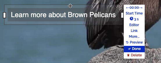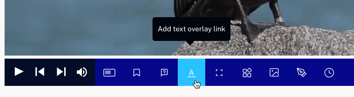 Text overlays are used to display text on a video during playback. The overlay can also be clickable and open another browser page when clicked. In the following example, the text overlay will appear at the 75% point of the video and display until the end of the video. Clicking the overlay will open a link in a new browser tab and pause the video.