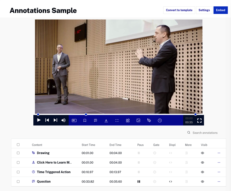 You can see also quickly see which annotations have annotation options set like pause, gate or display rules. The More icon primarily indicates that a link or custom code is set. The action menu (...) lets you edit, duplicate or delete the annotation. Click the Visibility icon to hide/show the annotation in the annotation editor. The visibility setting has no effect on if the annotation will be displayed inside videos.