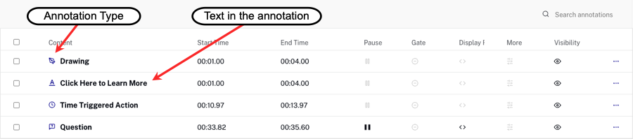 The annotation list is the best way to quickly scan all of the annotations and select which ones you need to take action on. There's no need to play the video to reach the annotation. You'll see at a glance an icon for the annotation type, the text of the annotation and start and end times.