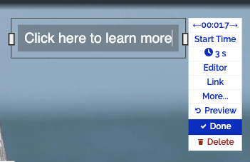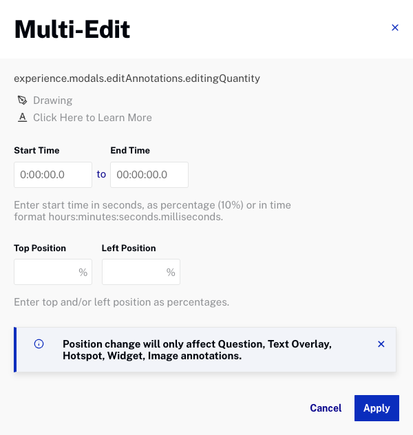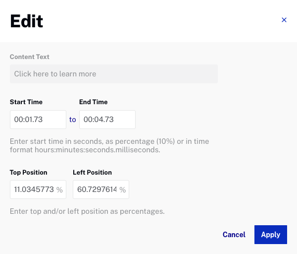 Clicking on an annotation name will jump the project to that timestamp and open a Quick Edit dialog that allows annotation properties to be edited. Depending on the annotation type, the top or left positioning as a % of the video can be set.