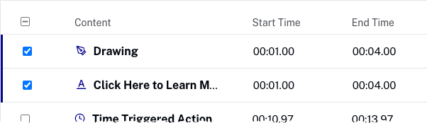 The annotation list displays a list of all the annotations on a project, template or experience. It also provides an easy way to edit, duplicate or delete annotations. The annotation list appears below the preview video when you edit a project, template or experience.