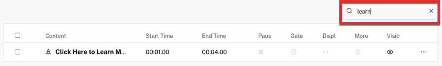 Searching is useful when you have a project with many annotations. Searching allows you to quickly find an annotation, for example, annotations that use the words "Learn more". To search for a term, use the search box in the annotation list header.