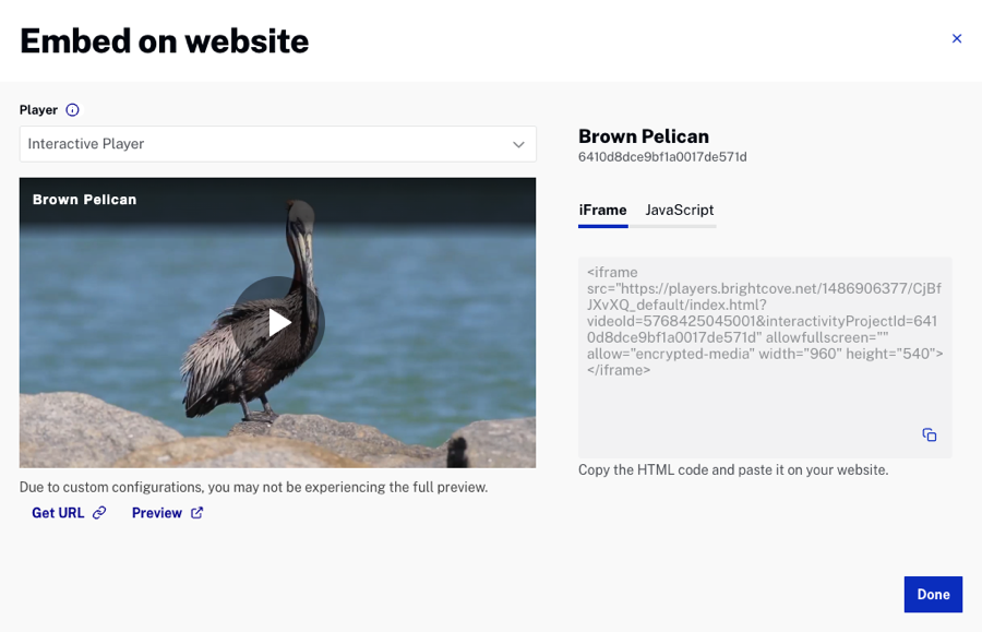 Previewing and generating embed code for a video
