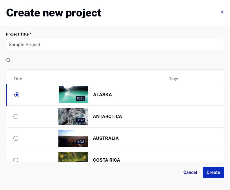 A Project is a single video with annotations. Annotations may include links, images, hotpots, quizzes, etc. that appear during video playback. There are two ways to create a project: