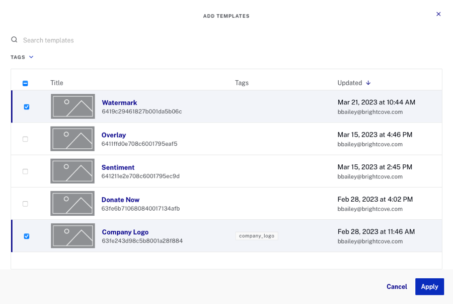 Tags can be added to templates as a way to quickly add annotations to videos that are published using an Interactivity-enabled player. If a published video has the same tag that was assigned to the template, the template annotations will be applied. This is a quick and easy way to add the same annotations to dozens or hundreds of videos.