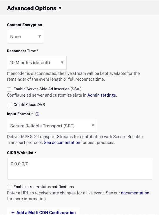- In the CIDR Whitelist section, enter a set of IP addresses that are allowed to connect to the SRT endpoint. This controls who can connect to the SRT endpoints. Note this option will only appear if the Input Format is RTP or SRT. You can specify