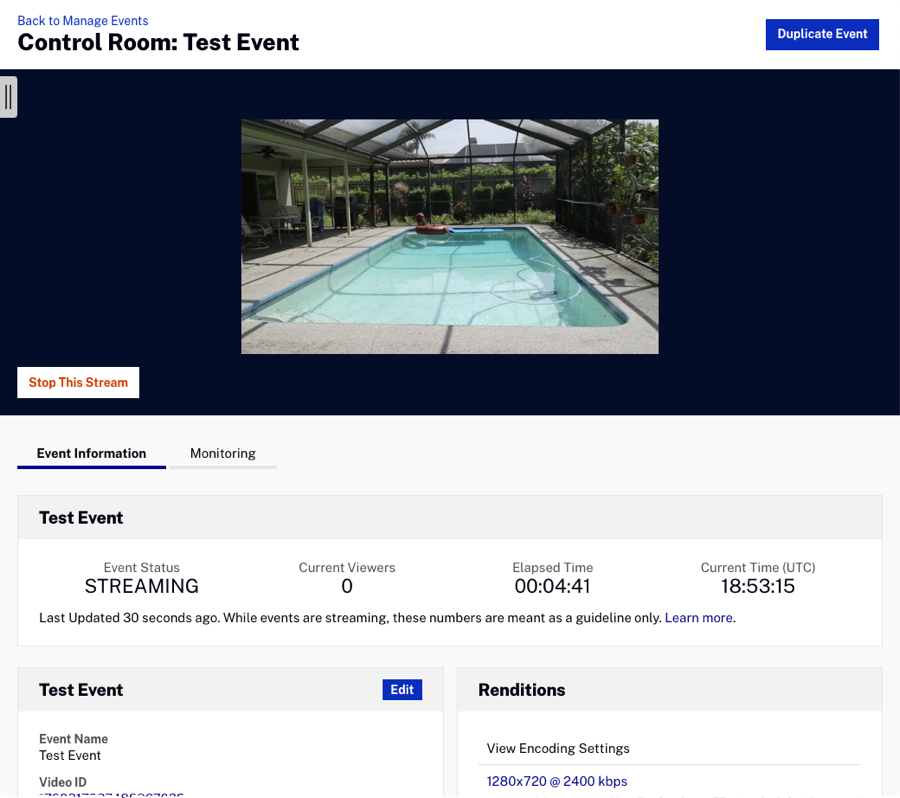 - Confirm that you can see the live stream. Note that after starting the encoder, it may take a minute for the live stream to appear.