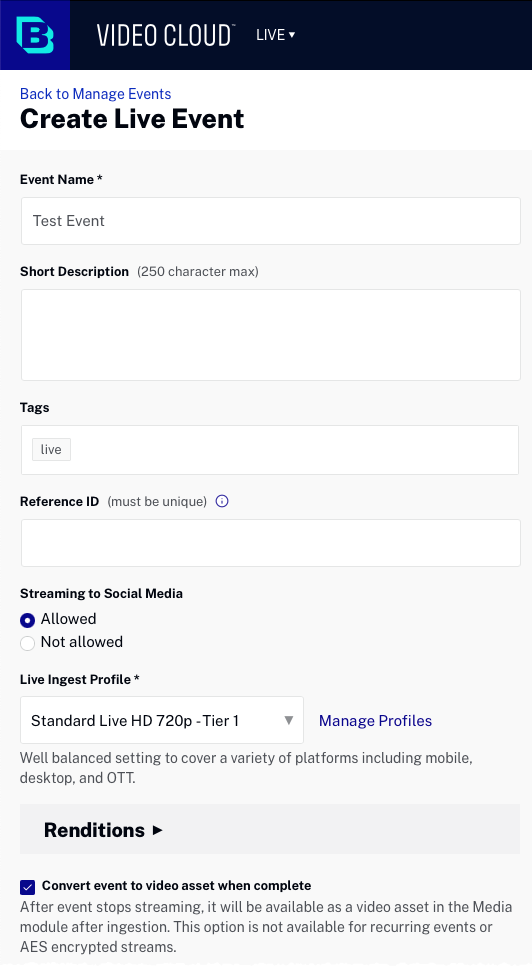 - Select Convert event to video asset when complete. This will save the event as a video in the Media module.