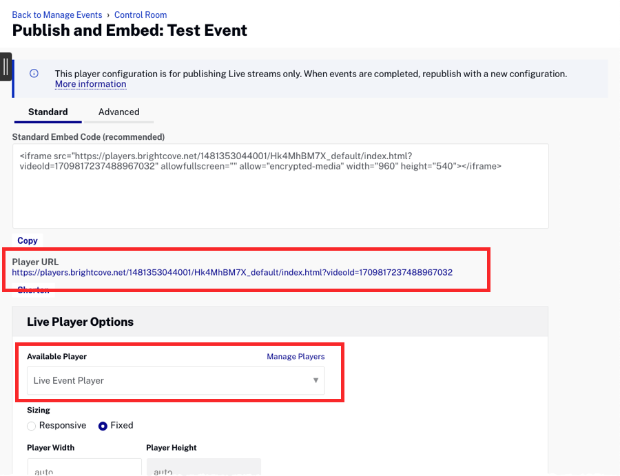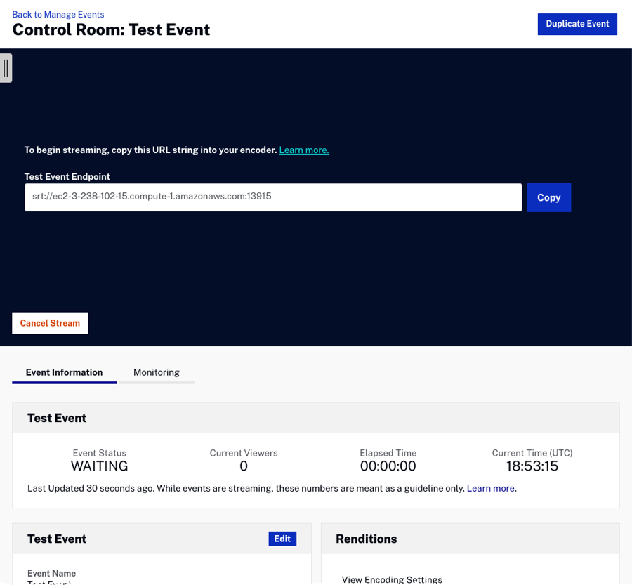 - If the Control Room page for the event is not displayed, click the Live tab to display a list of live events. Click on the event name to open the Control Room page.