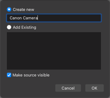 - In the Sources section, click + to add a new source. Select a Source from the list. This Quick Start is using a camera for video capture so Video Capture Device is selected.