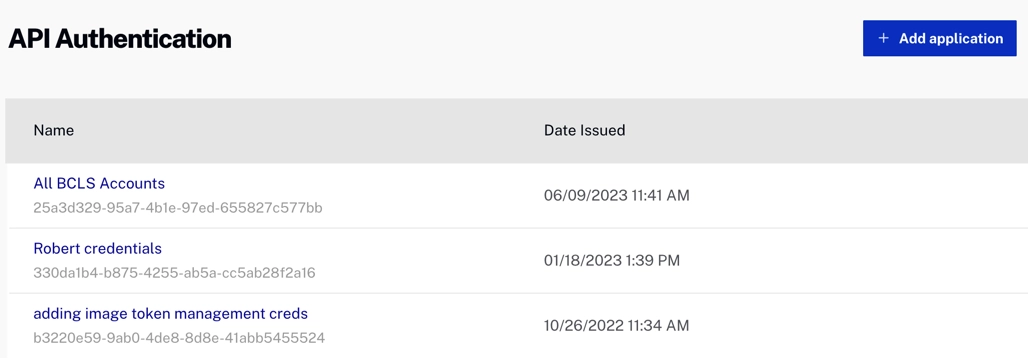 - Click API Authentication. The API Authentication page opens, displaying your current client registrations.