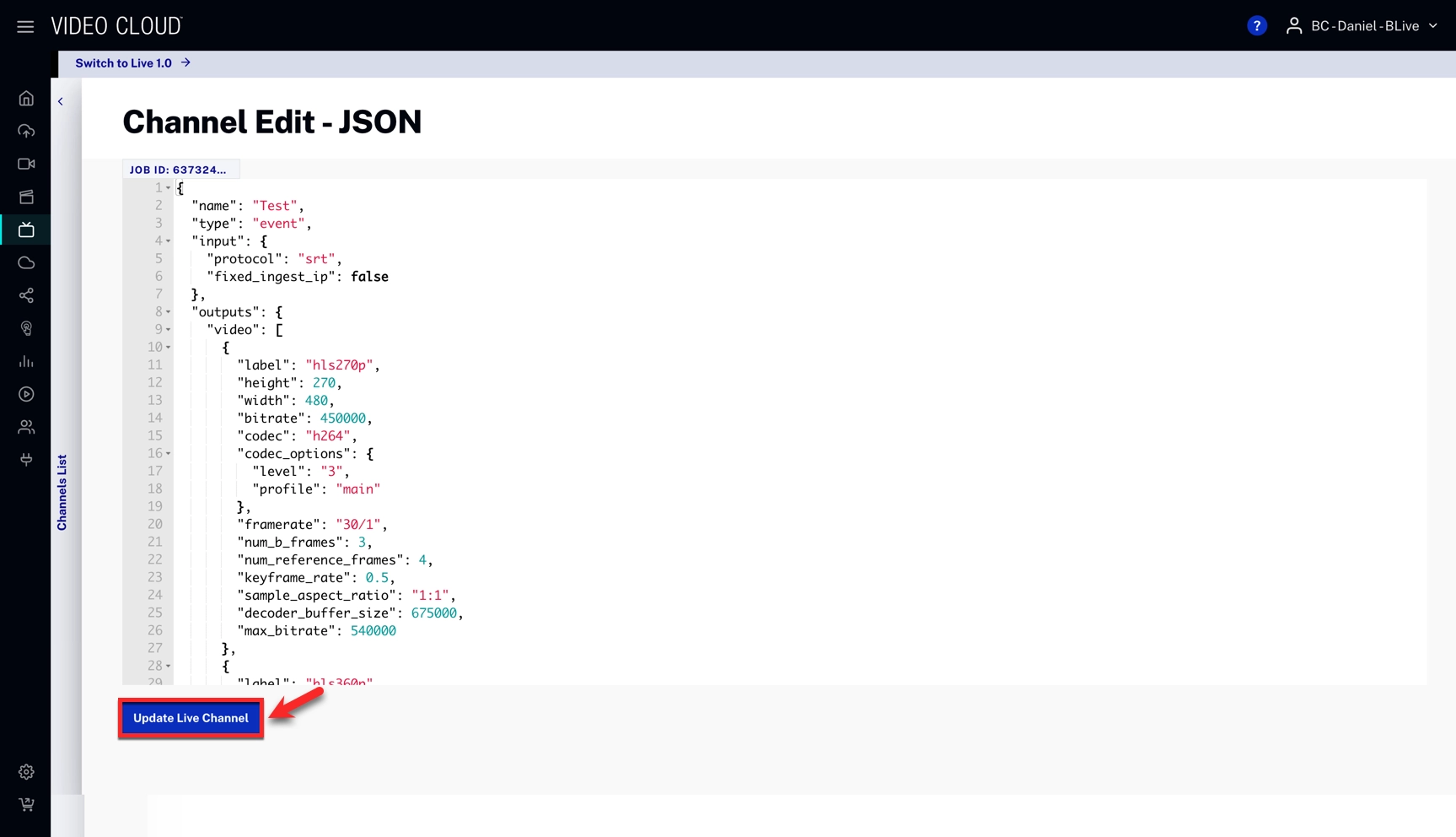 • Edit - Click edit to view/edit the Channel Edit - JSON (only available when streaming is stopped).