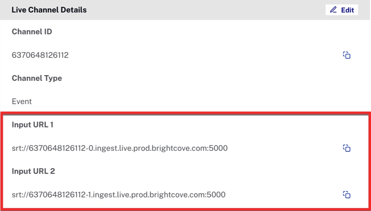 - After the event is created, note the SRT/RTMP Ingest URLs for both primary and backup feeds.