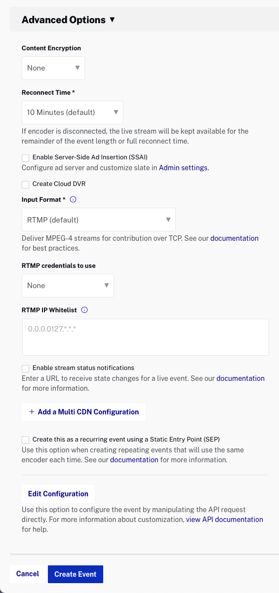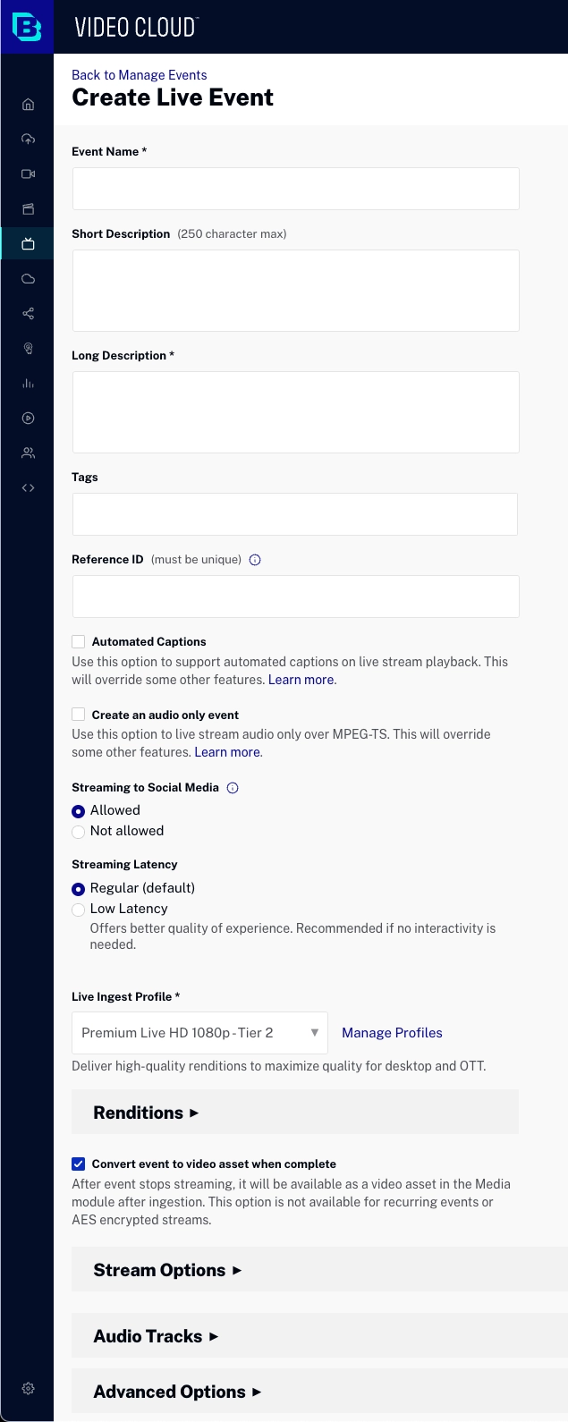 - Event Name - Name for the event; this name will also appear in the Media module if the video is saved as a video asset (max 255 characters)