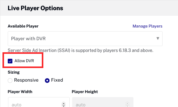 - When Allow DVR is checked, the player will request the DVR manifest instead of the live manifest. This option is only available if the event was created with the Create Cloud DVR option selected. If the event is published using a Brightcove Player version earlier than 6.33.0, the Live DVRUX Plugin is required.