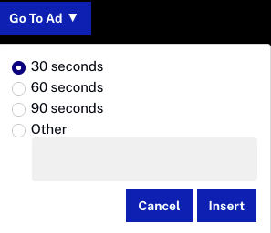 If the Enable Server Side Ad Insertion (SSAI) option was selected when the event was created, the Control Room page will display a Goto Ad button. When clicked, the length of the ad break can be selected.