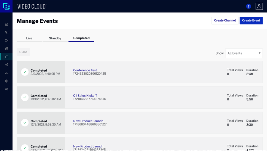The Show dropdown can be used to filter the events that appear on the Completed tab.