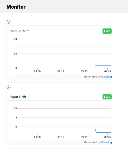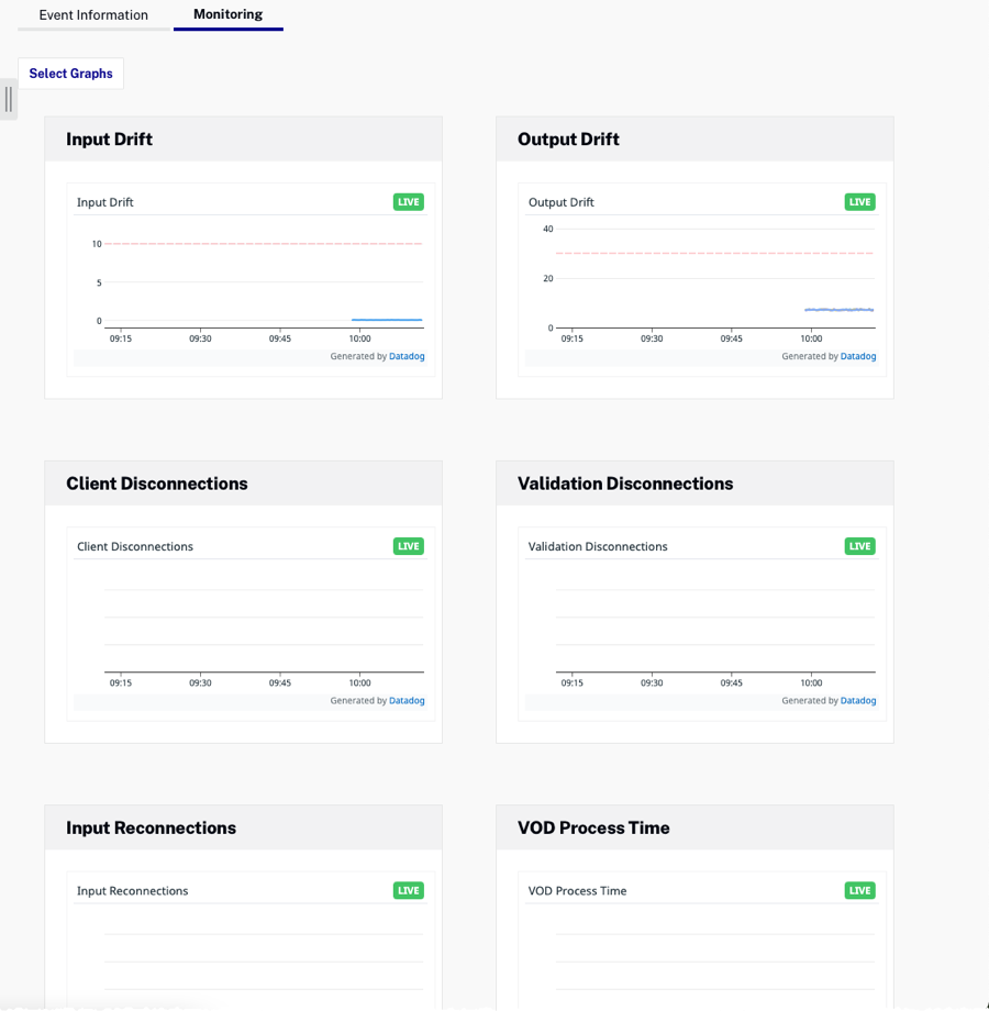 By default, the Live module will display a Monitor section with Output and Input Drift graphs. If you would like to enable the extended monitoring, please contact your Brightcove account representative. Extended monitoring will display a Monitoring tab below the preview player. The monitoring information is available while an event is in progress and for up to 1 hour after the event ends.