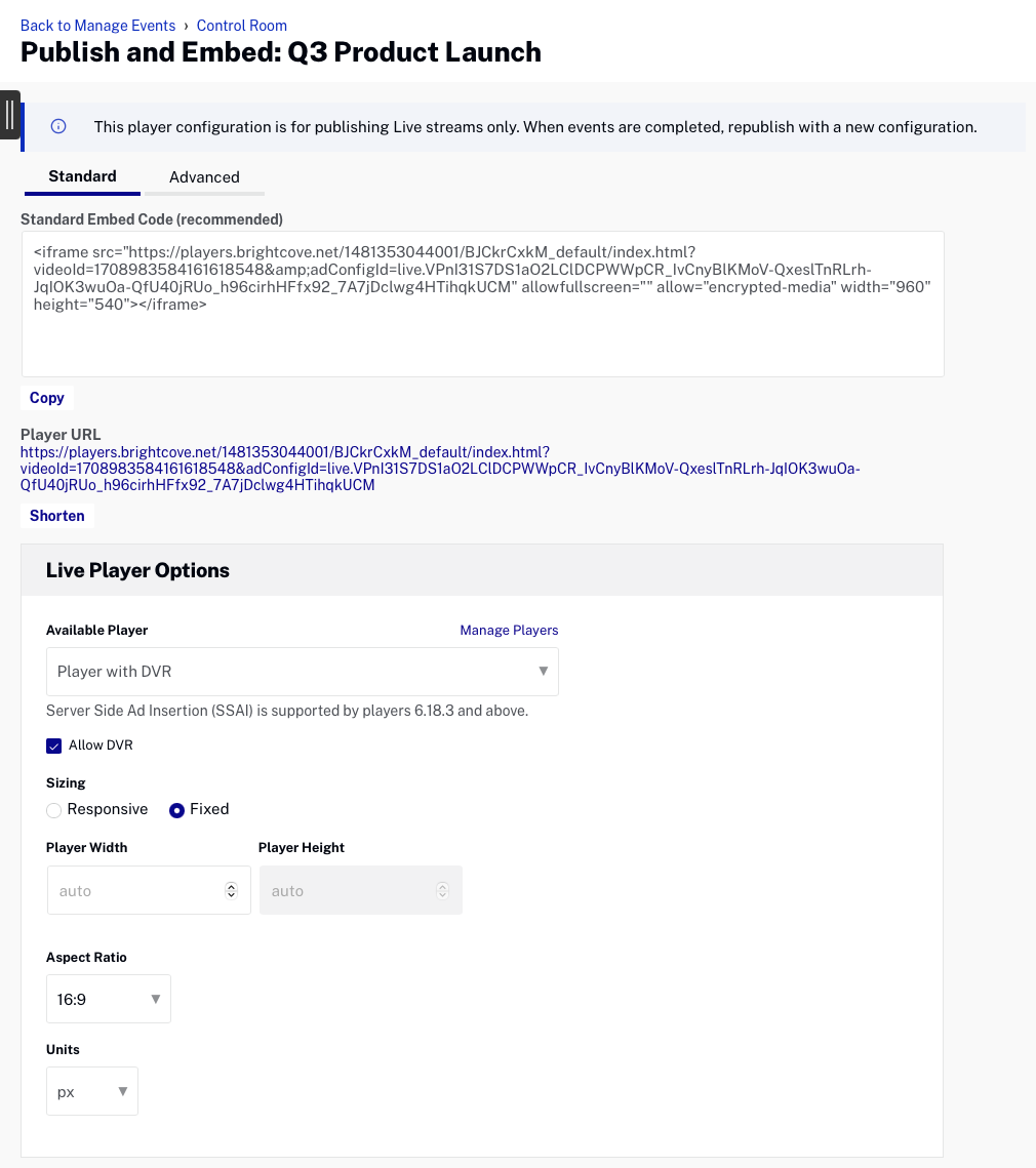 - Click the Player URL to preview the event in a browser or copy the appropriate embed code to use.
