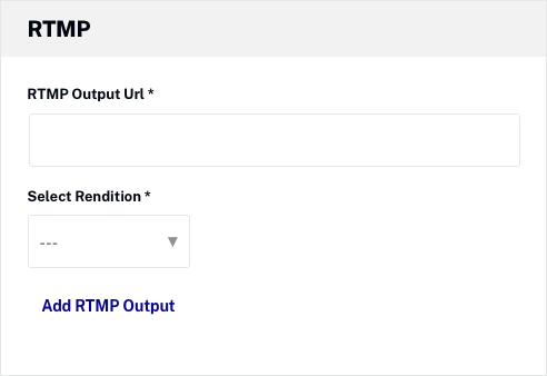 Enter the RTMP Output URL and the Rendition to send. Note that the format of the output URL may change depending on where the RTMP stream is being used. For more information, see Using Live RTMP Outputs to Stream to Facebook and YouTube.