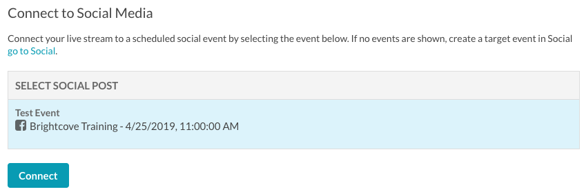 - Click Connect to Social Media in the left navigation. A list of scheduled social events will display. If no events display, no scheduled events exist.