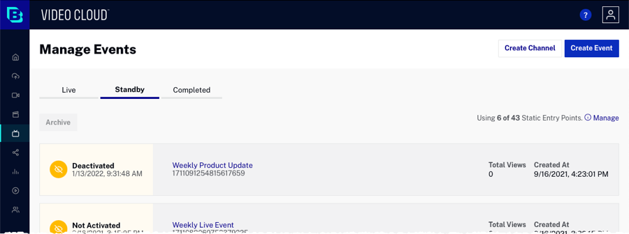To access the Live module, login to Studio and click Live in the primary navigation. After logging in, your Brightcove account name will appear in the upper right corner of the page. If you have multiple accounts, use the account switcher dropdown to select the account you would like to work with. If the account you select hasn't been enabled for Live, an introductory "Brightcove Live" video page will appear. The Manage Events page displays three main tabs: