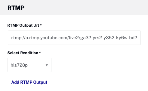 9. In the Live module, paste the Stream key at the end of the RTMP Output URL field. The RTMP Output URL field will be the YouTube Stream URL with the Stream key appended, all as one value.