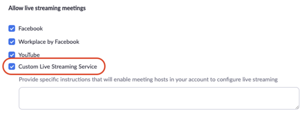 - Make sure your Zoom account settings have the Custom Live Streaming Service enabled.