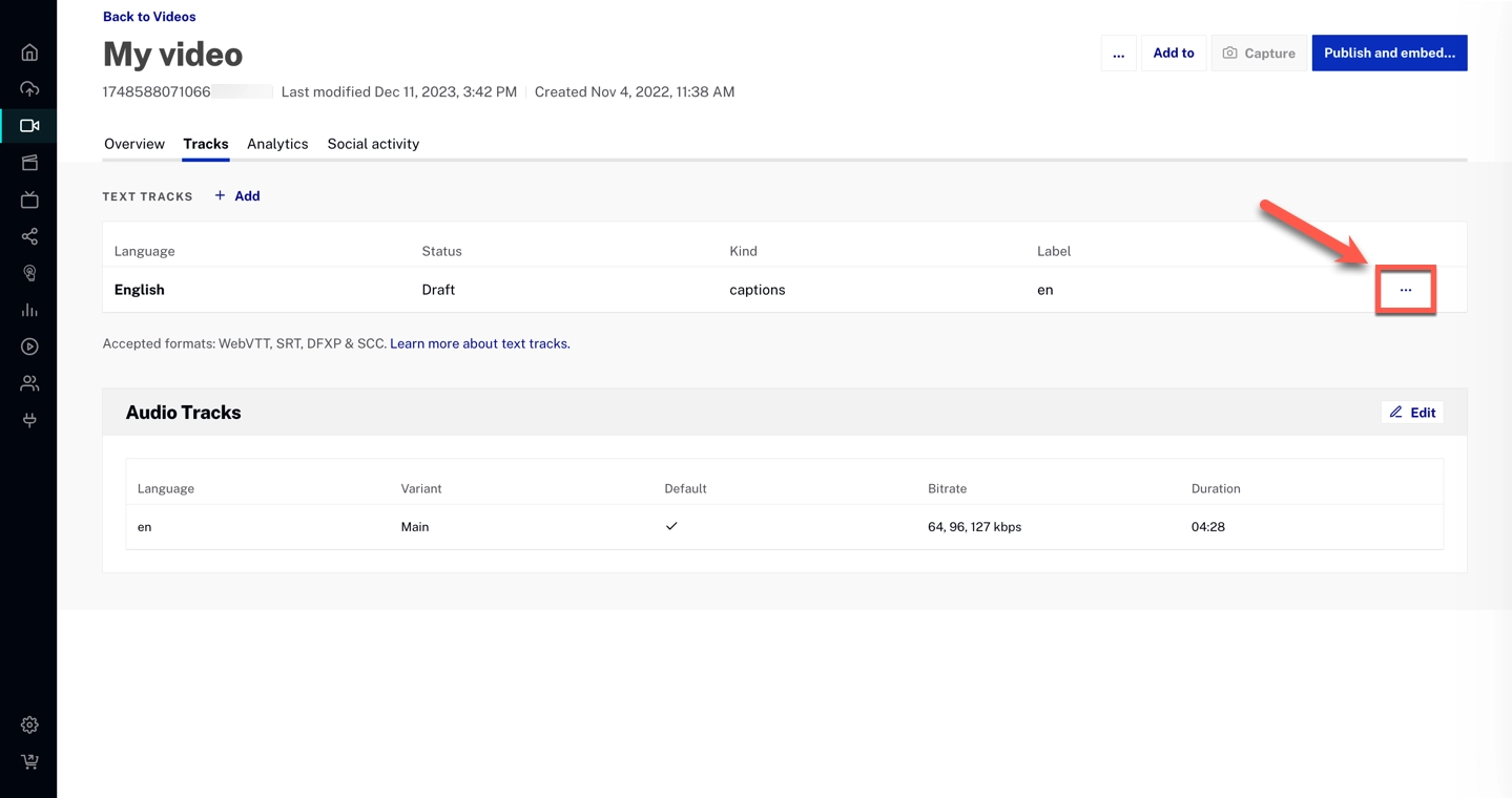 To edit the properties of existing captions, click in the Text Tracks panel, and select the Edit track on the captions item that you want to edit: