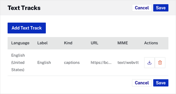To view and edit the text track properties for a video, open the Media module , click the video title link and locate the Text Tracks section.