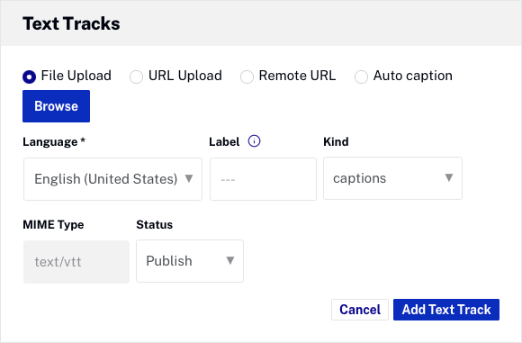 - File Upload - Click Browse and select the text track file from the file system. The file will be uploaded to .
