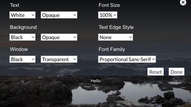Viewers on desktop and Android devices can change the appearance of the captions by using the captions settings menu.