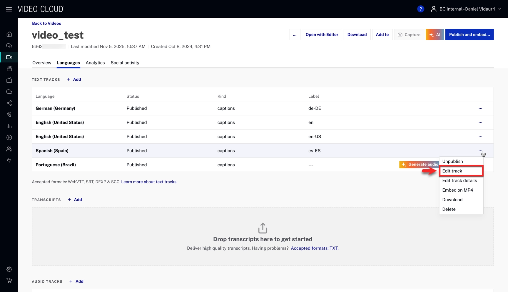 - Click ... and select the Edit track option.