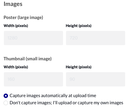 When a video is uploaded to Video Cloud, poster and thumbnail images are created automatically by taking a snapshot from the source video at the midway point. The size of the poster and thumbnail is based upon the dimensions specified in the ingest profile used when uploading the video.