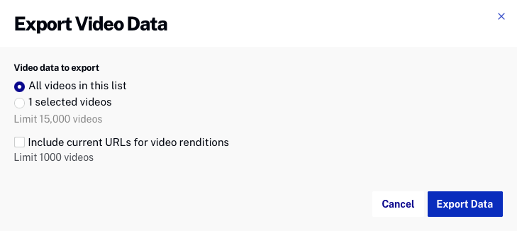 - Check Include current URLs for video renditions to include the video rendition URLs. Checking this option with a large number of videos selected will increase the time required to generate the export file.