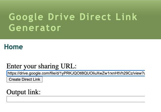 6. Navigate to https://sites.google.com/site/gdocs2direct/home. Other sites are also available than will generate a direct link to Google Drive files.