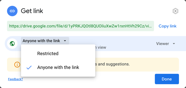 4. For the permissions, make sure you select the option so that Anyone with the link can access the file. If the permission is set to Restricted, the upload will fail.