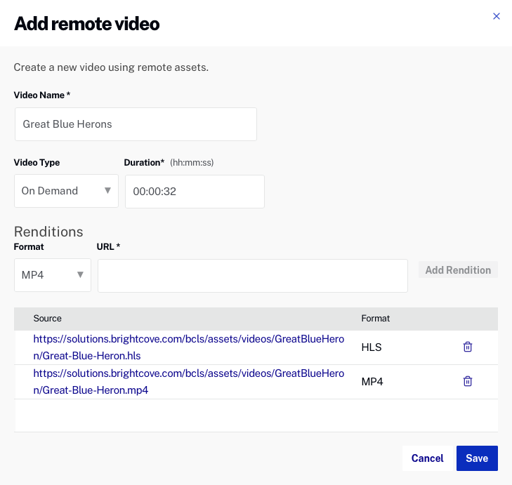 - For On Demand video types, enter the Duration in hh:mm:ss format.