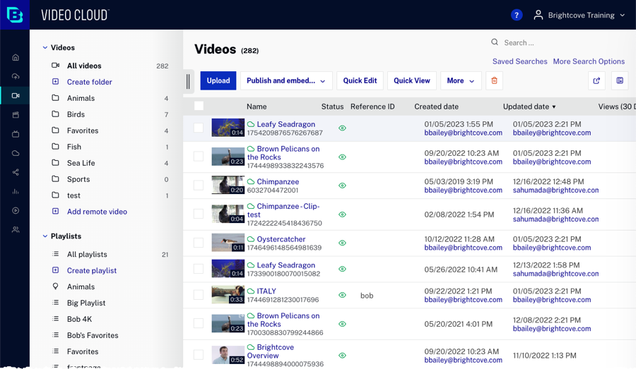 The user ID of the user who created and/or updated the video will be displayed in the Created Date/Updated Date columns. If the action was taken via the CMS API, Updated by API will be displayed. Note that if a user who performed an action is removed from an account, their ID will still appear.