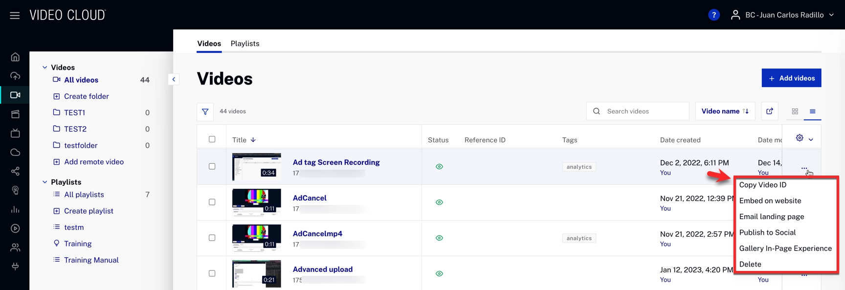 This menu provides easy access to commonly used video management tasks. This menu is accessed by clicking ••• on the right side of each video entry.