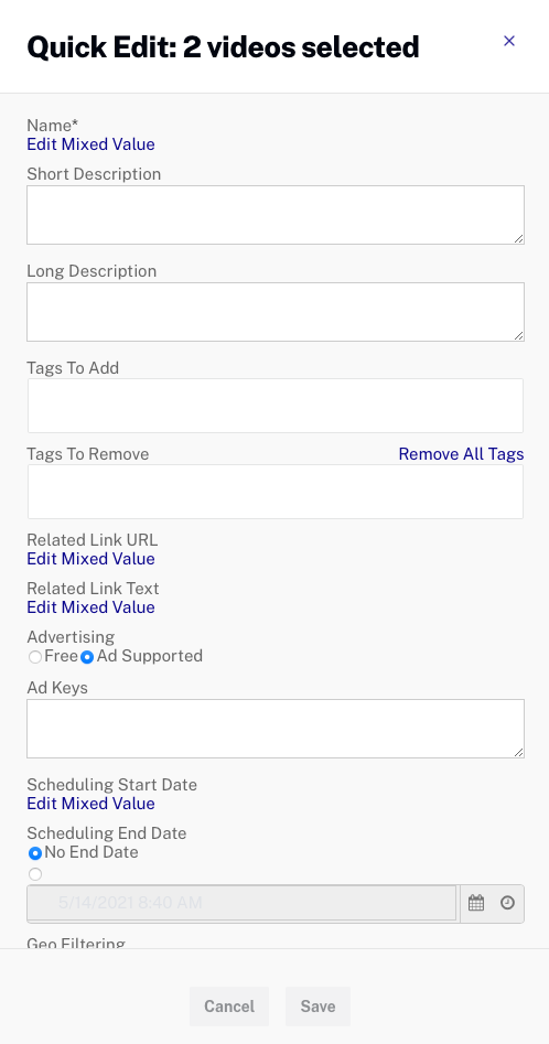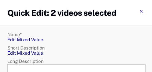 - When at least one video has values assigned to a property, Edit Mixed Value will be displayed
