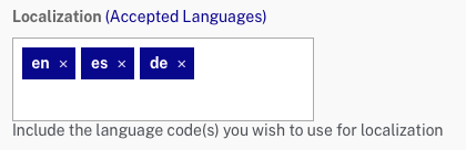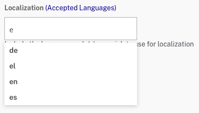 - In the Localization field, enter the two letter language code for the language and press enter. As you type, the language list will be filtered. You can also click on a value to select it.