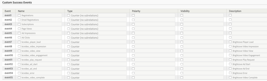 Every Brightcove event that will be tracked must be created as a Custom Success Event in Adobe Analytics. The event IDs from Adobe will then be used inside the Players module. This allows Brightcove event data to be passed to Adobe Success events. Review the list of events below to determine which events you want to track.