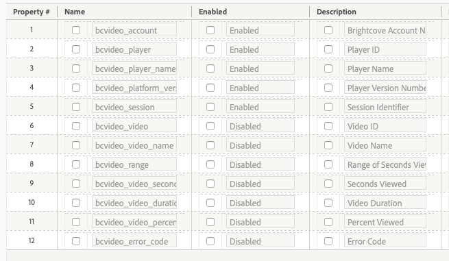Parameters carry additional data and are passed with events. Every Brightcove parameter that will be recorded must be created as a Traffic Variable in Adobe Analytics. The parameter named will then be used inside the Players module. This allows Brightcove parameters to be passed to Adobe Traffic Variables. Review the list of parameters below to determine which ones you want to capture.