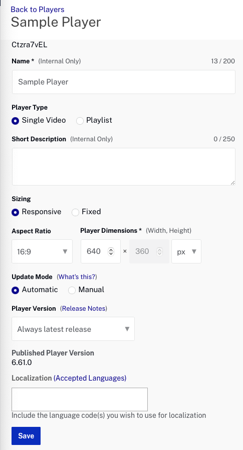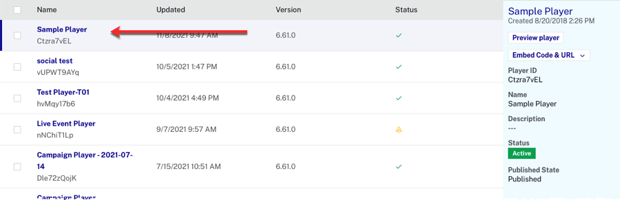 - Click the link for the Sample Player to open the player properties page.