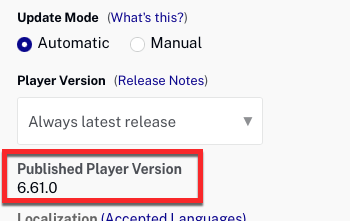 Note that all players may not be the same version. As Brightcove continues to develop and improve the Brightcove player, new player versions will be released. By default, updates are applied to all players automatically. To prevent auto-updating of a player, you must set the Update Mode setting to Manual (also known as locking a player). For more information, see Setting the Player Update Mode and Version.
